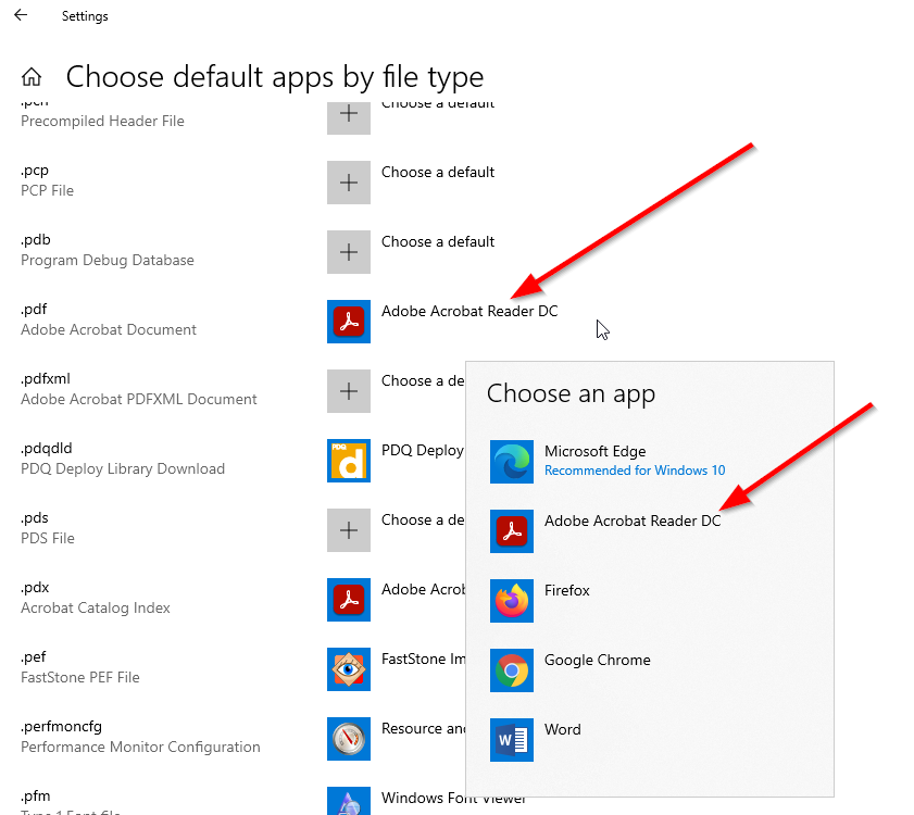 1) Search for Default Apps. 2) Since the PDF viewer is not on of the top 6 choices on this screen, we need to scroll down and select "Choose default apps by file type" 3) Scroll down to find the file extension (.pdf), then click on the name of the current default app to see a list of available apps. Choose your favorite!